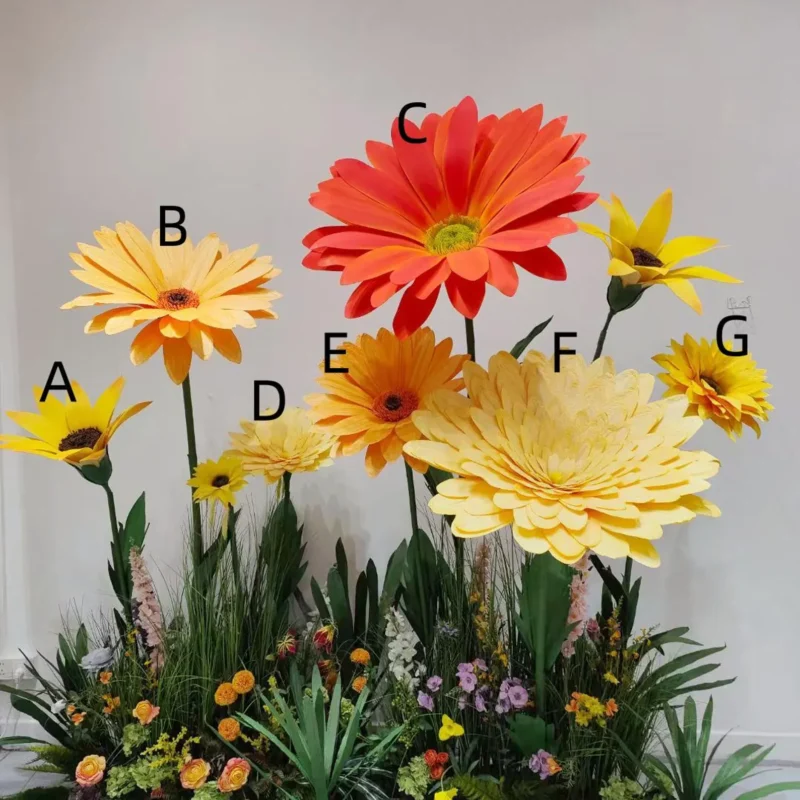 🌸 These oversized flower sculptures in light yellow, sunny yellow, and striking orange-red create a bold, cheerful, and unforgettable backdrop for any event or photo installation.