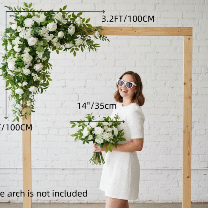 ✨ Dimensions Corner swag: 3.7FT x 3.7FT / 115CM x 115CM Tieback: 1.6FT x 1.9FT / 50CM x 60CMDesigned for wooden arch frames, this floral set features a cascading corner design paired with a complementary side piece. Together, they create a charming and whimsical focal point perfect for outdoor weddings, rustic themes, or colorful celebrations….