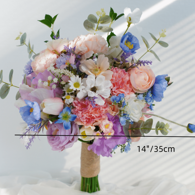🌸 A luxurious silk bridal handheld design featuring a vibrant mix of pink, blue, and lavender blooms with rustic twine wrapping, perfect for a whimsical, garden-style, or bohemian wedding.
