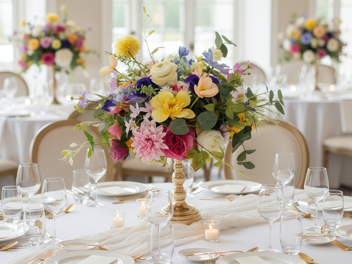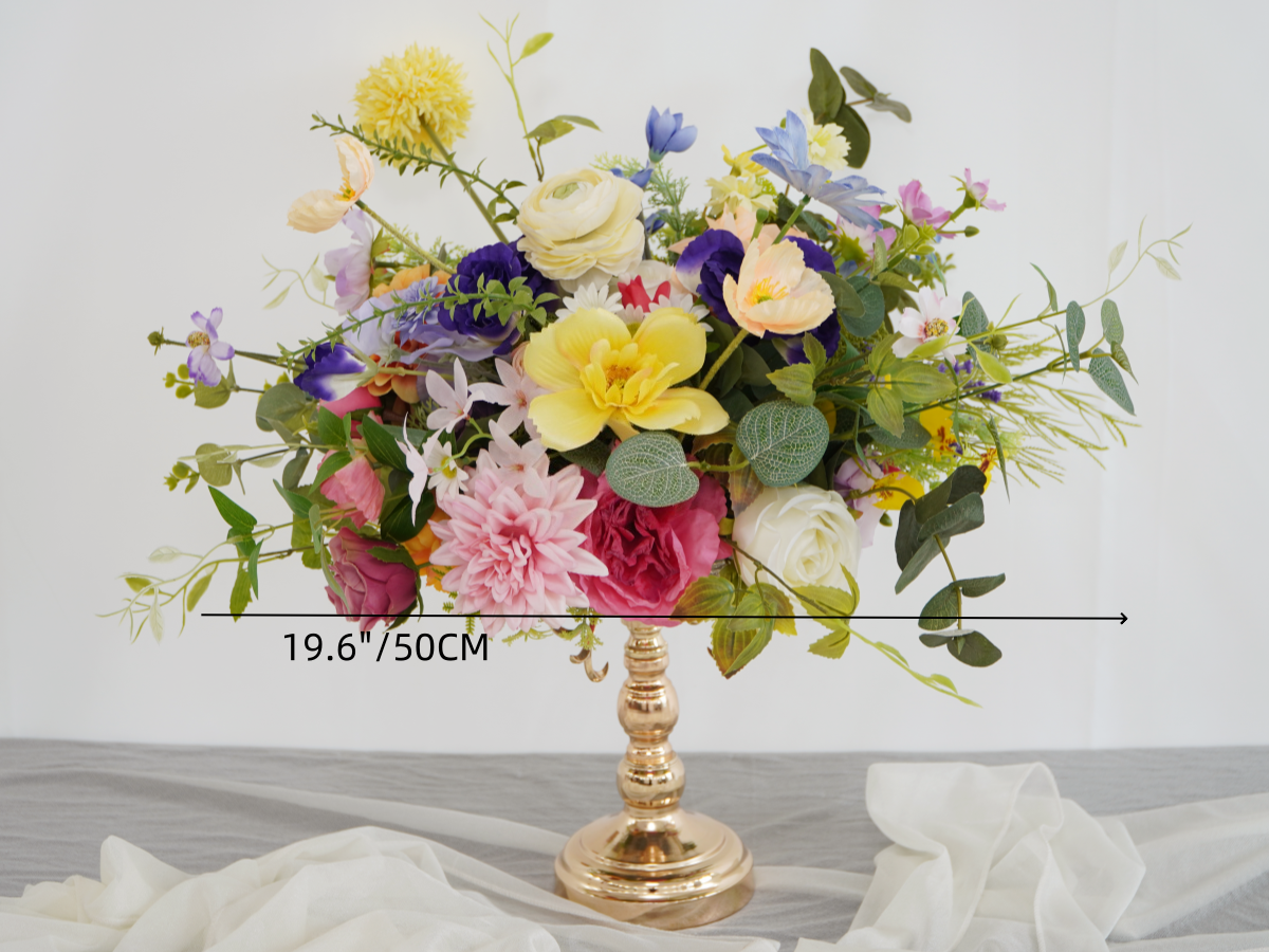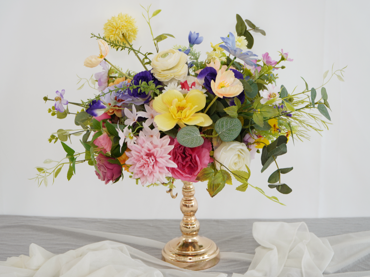 🌸 Style & Materials This striking centerpiece is crafted from high-quality, lifelike silk and faux-touch dahlias, roses, ranunculus, and filler flowers. The bold, multi-hued design features a dominant blend of deep purples, sunny yellows, bright pinks, and white accents, generously layered with vibrant green foliage. The elevated, overflowing style creates a dramatic, celebratory focal point, perfect for adding saturated color to any grand reception.