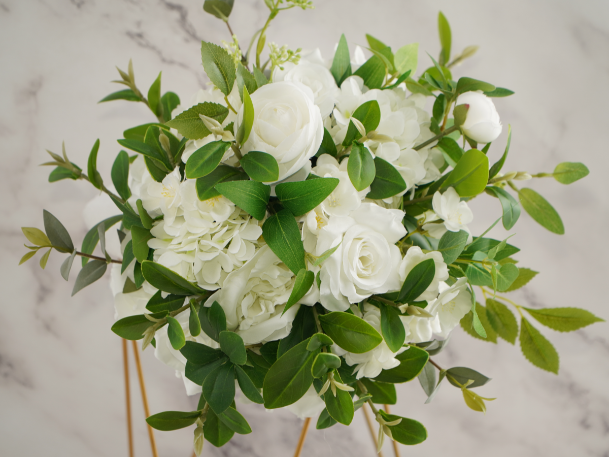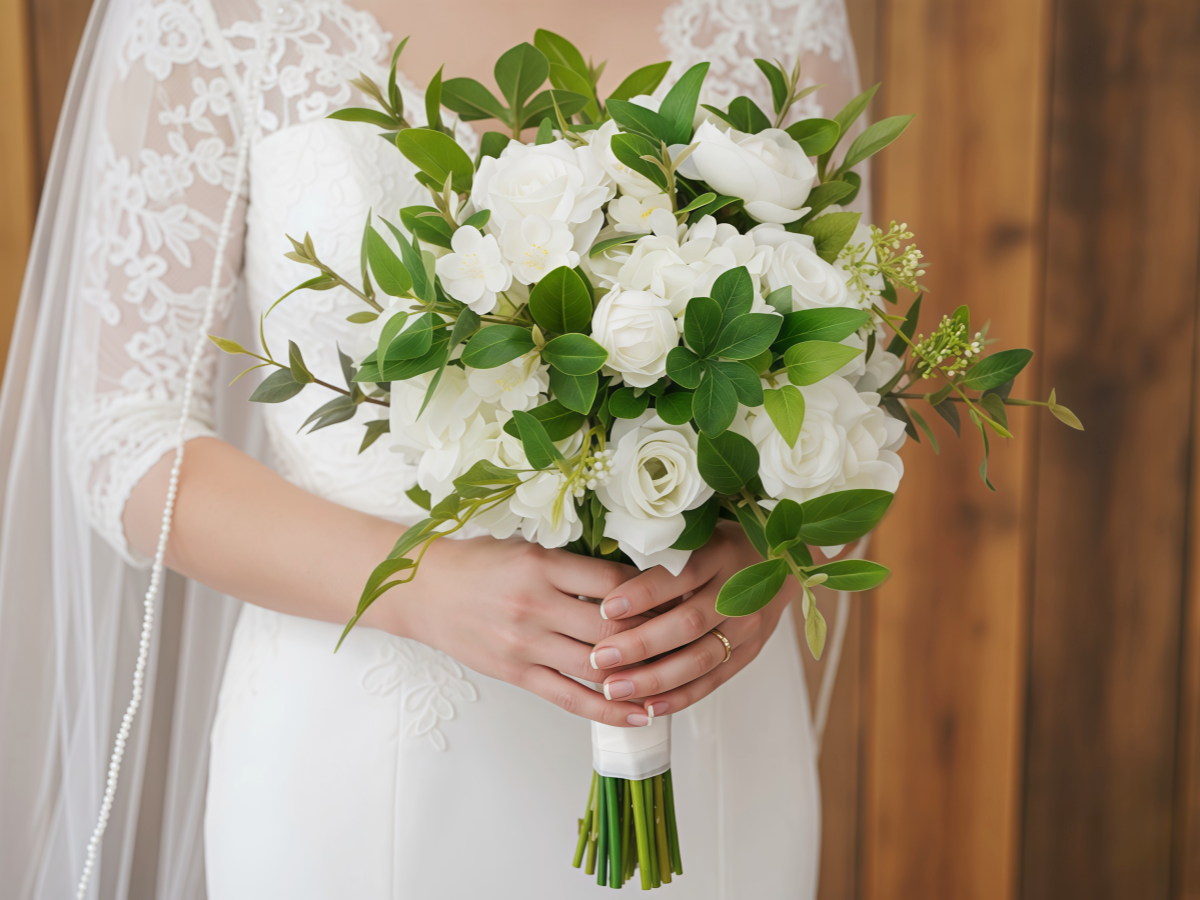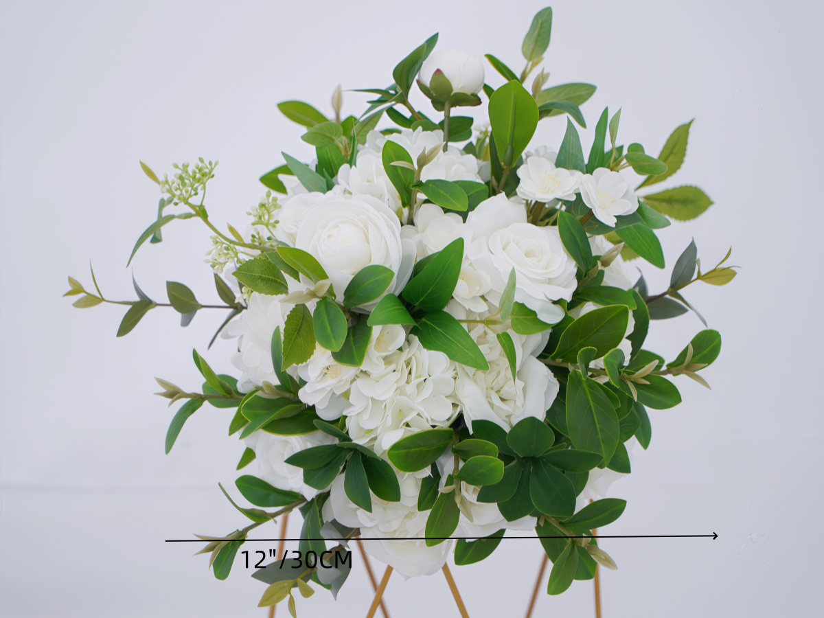 🌸 Style & Materials This refreshing bouquet is crafted from high-quality, lifelike silk roses, ranunculus, and filler blooms in a clean, pure white and creamy ivory palette. The design features a substantial amount of lush, vibrant green foliage (including glossy leaves and various sprigs) that encircles the blooms, creating a classic, garden-fresh aesthetic. The full, round shape and the high contrast between the white flowers and the deep green leaves make this a timeless and crisp choice for any season.