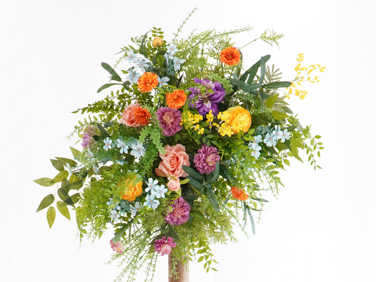 🌸 Style & Materials This vibrant set is crafted from high-quality, lifelike silk and faux botanicals, designed in a loose, meadow-inspired wildflower style with abundant greenery. The cheerful and bold palette features a mix of bright orange, sunny yellow, and deep purple/violet blooms, intertwined with various filler flowers and lush foliage. This aesthetic perfectly captures a rustic, bohemian, or outdoor garden wedding feel, providing a stunning, long-lasting focal point.