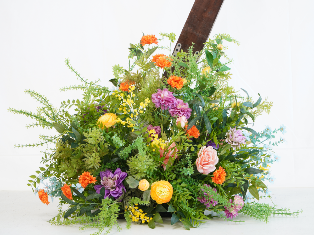 🌸 This vibrant silk floral set features a gorgeous mix of orange, yellow, and purple wildflowers, creating a stunning and lasting focal point for any outdoor ceremony backdrop.