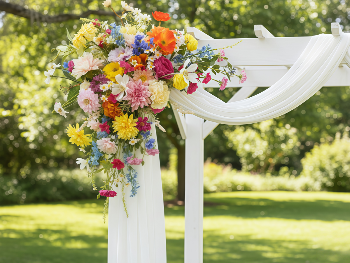 Wildflower Wedding Arch Flowers Pastel Pink, Blue, and Yellow Garden Arrangement