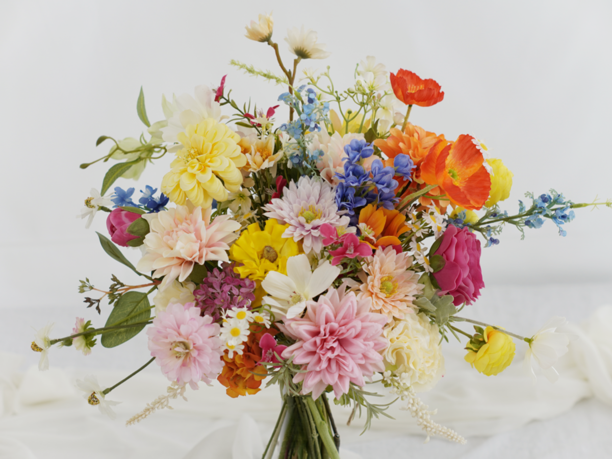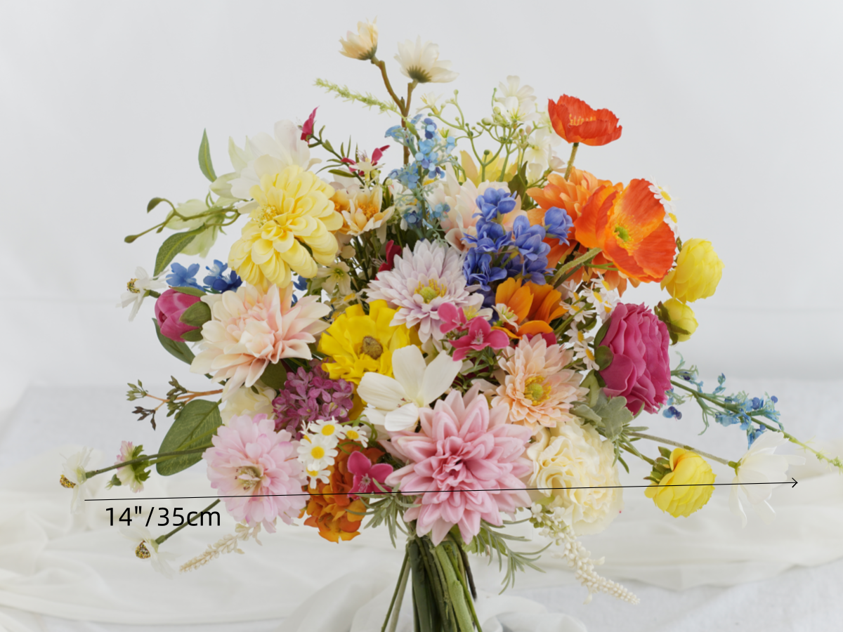 This charming three-piece design is crafted from high-quality, lifelike silk flowers, featuring a romantic mix of soft colours, including blush pink roses, creamy peonies, light blue hydrangeas, and sunny yellow daisies. The arrangement is full, cascading, and asymmetrical, combining classic garden blooms with delicate purple lavender and white accent flowers. The Soft Pastel color palette creates a light, airy, and whimsical aesthetic, ideal for rustic chic, cottage garden, or springtime wedding themes.