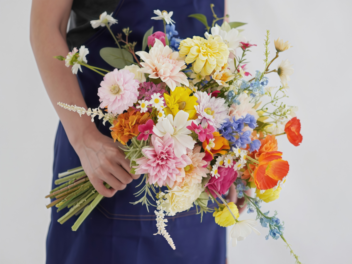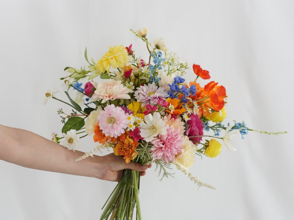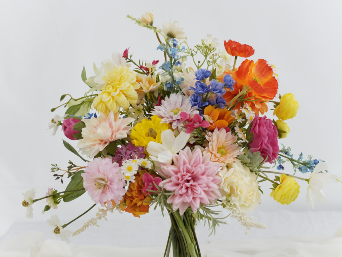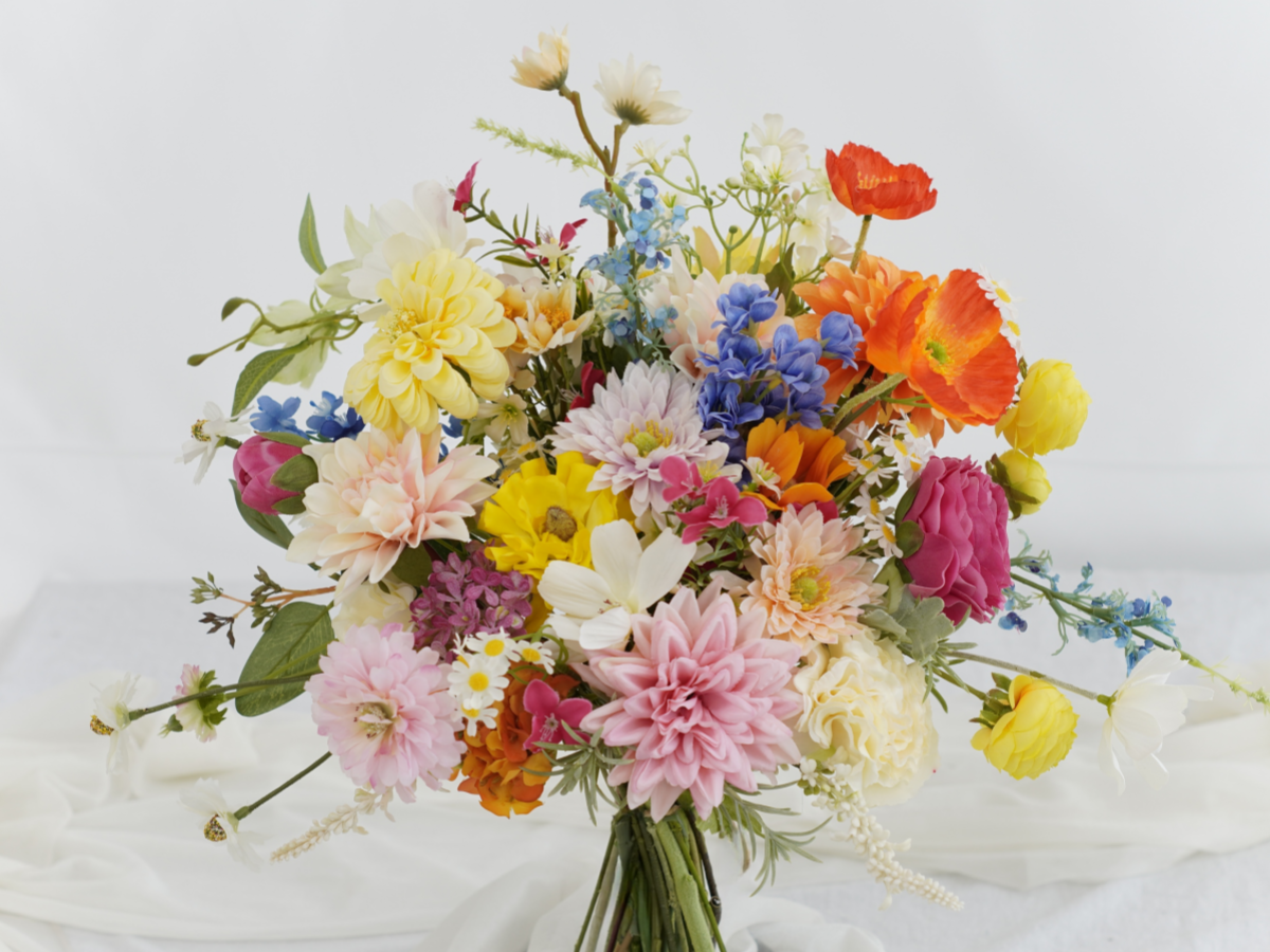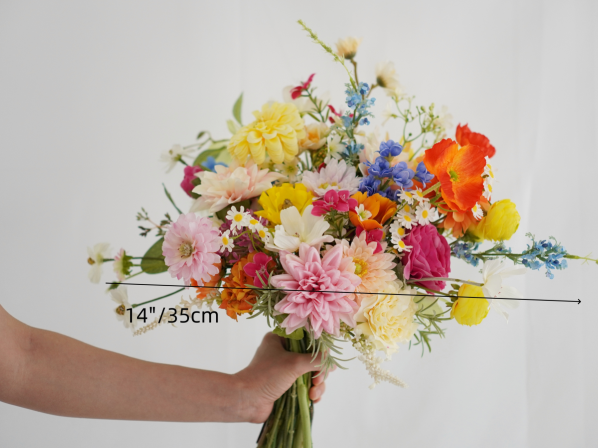 🌸 Style & Materials This delightful bouquet is crafted from high-quality, lifelike silk and faux-touch flowers in a vibrant, natural Wildflower style. It features a spontaneous mix of bright blooms, including dahlias, poppies, daisies, and blue and yellow fillers. The multi-colored palette is cheerful and varied, with pops of bright orange, fuchsia, yellow, and blue, creating a fresh, “just-picked” meadow feel. This arrangement is perfect for rustic, bohemian, or outdoor-themed weddings.